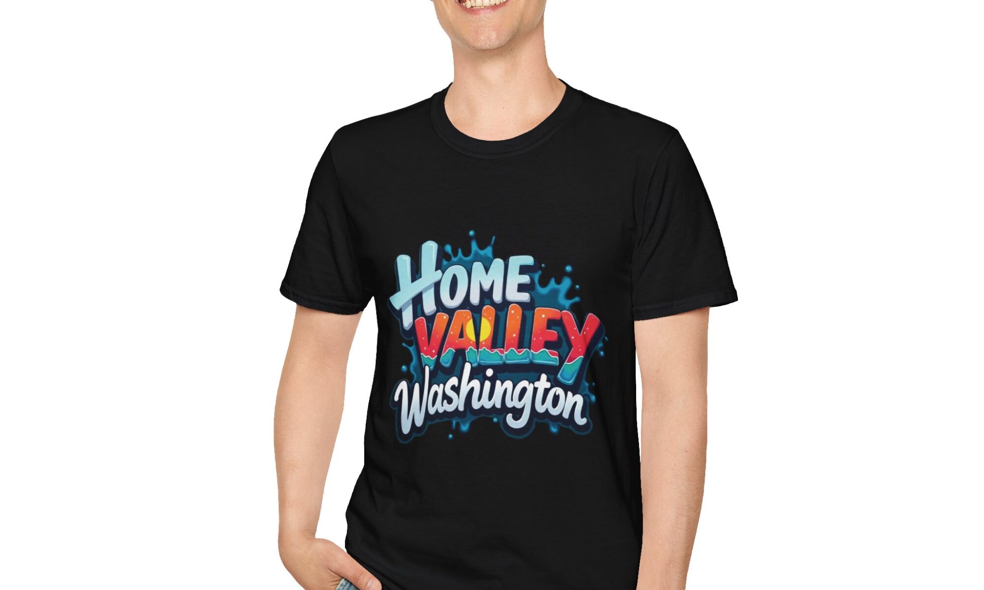 A lightweight, soft cotton tee that wears like a comfortable second skin and proudly shows off hometown pride. The bold, graffiti-style “Home Valley Washington” artwork pops against the clean background, with layered colors and paint-splash accents that read lively and authentic. Breathable ring-spun cotton and a classic crew neckline keep the silhouette familiar and easy to layer. Wear it to casual meetups, local fairs, or when you want to carry a piece of your place with you — it feels lived-in from the first pull-on and keeps its shape through repeated washings.