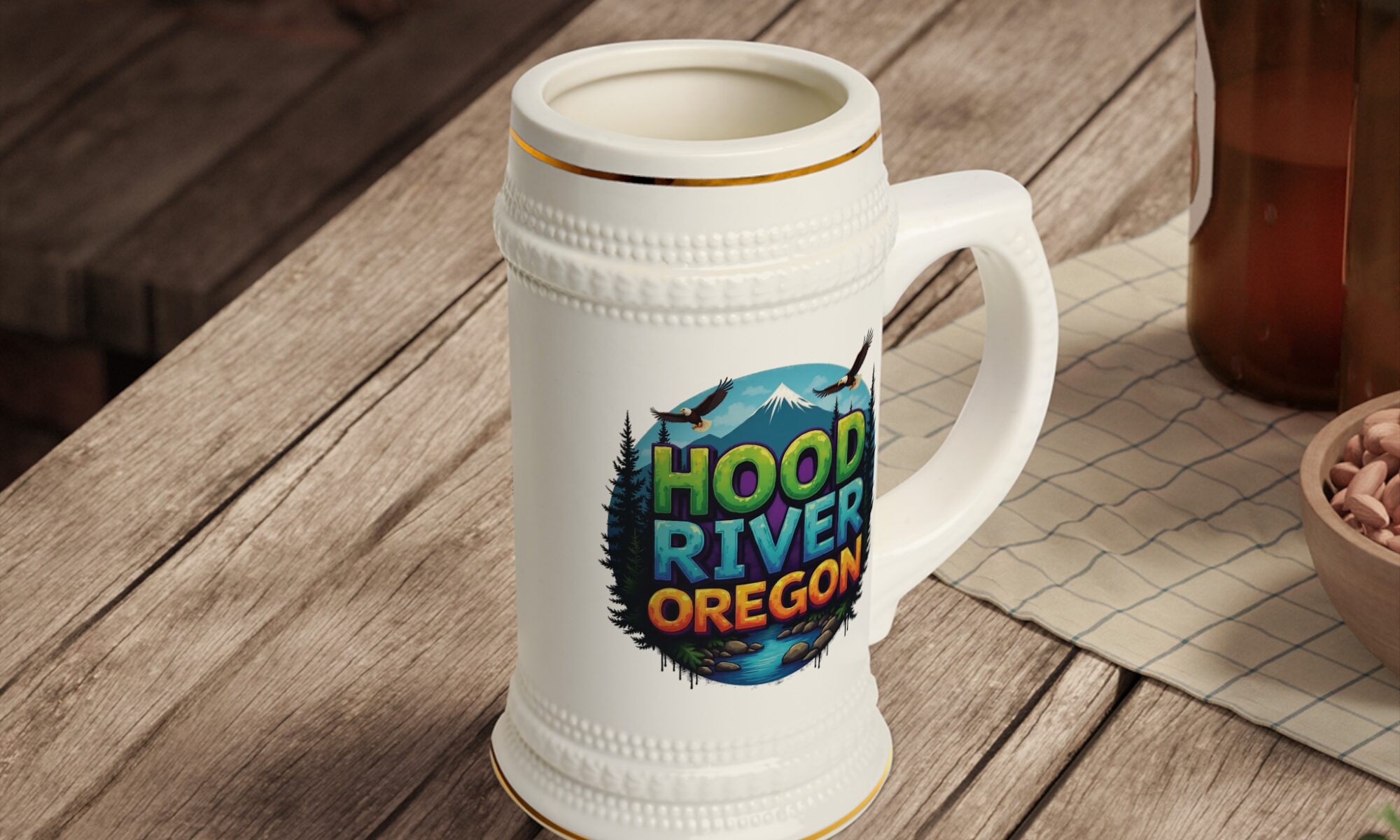 Raise a glass to long summer evenings by the river with this classic ceramic stein. Its heavy 22oz capacity and wide handle feel grounded in your hands — built for slow sips and storytelling. The bright ORCA print holds sharp against the white ceramic, while subtle gold trim on the rim and base gives the piece an old-world