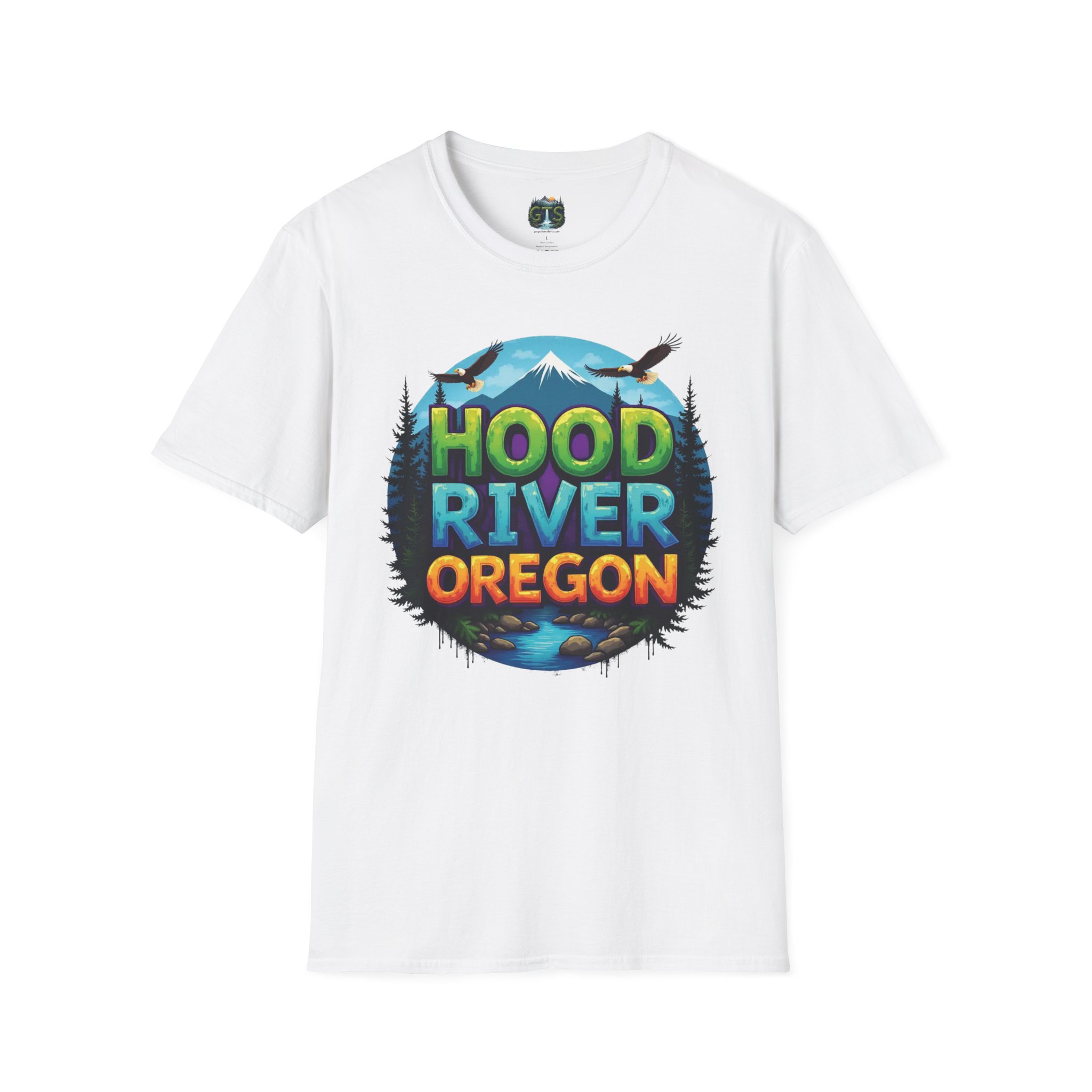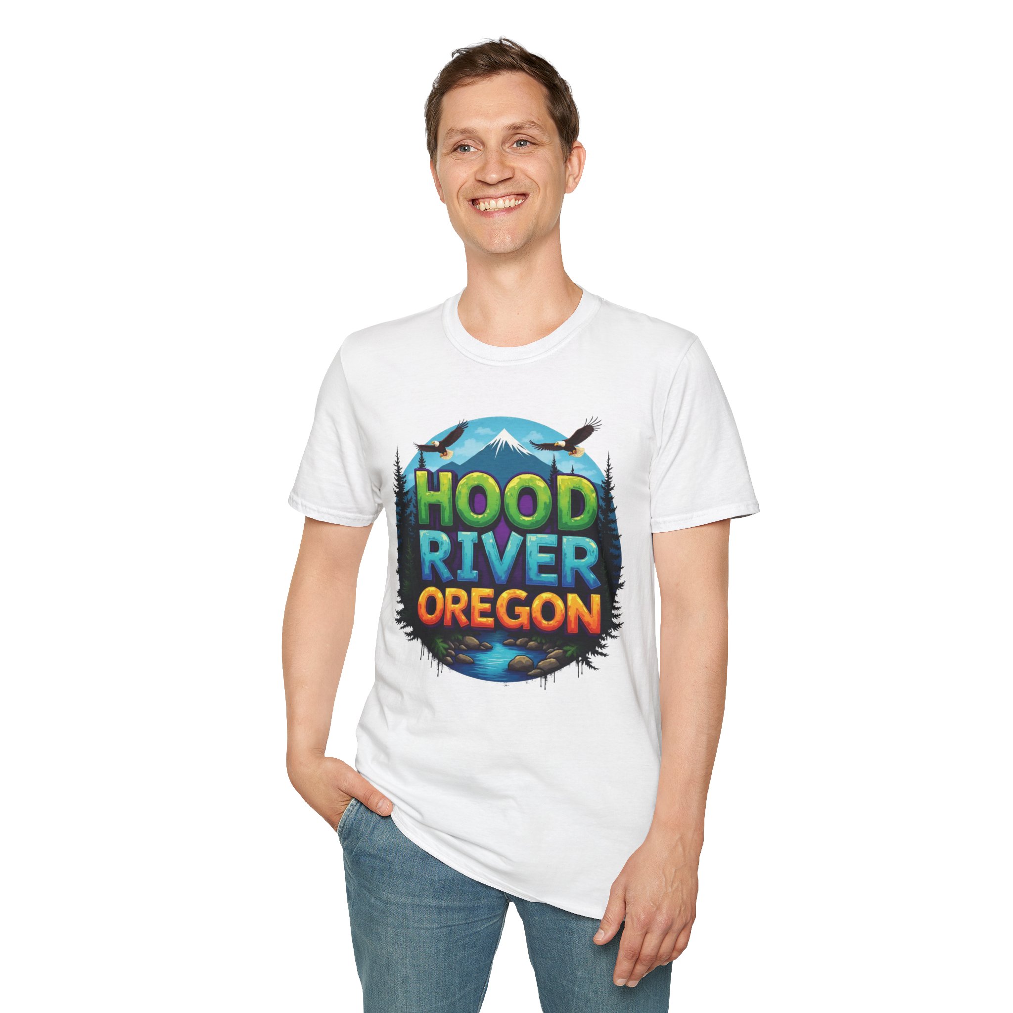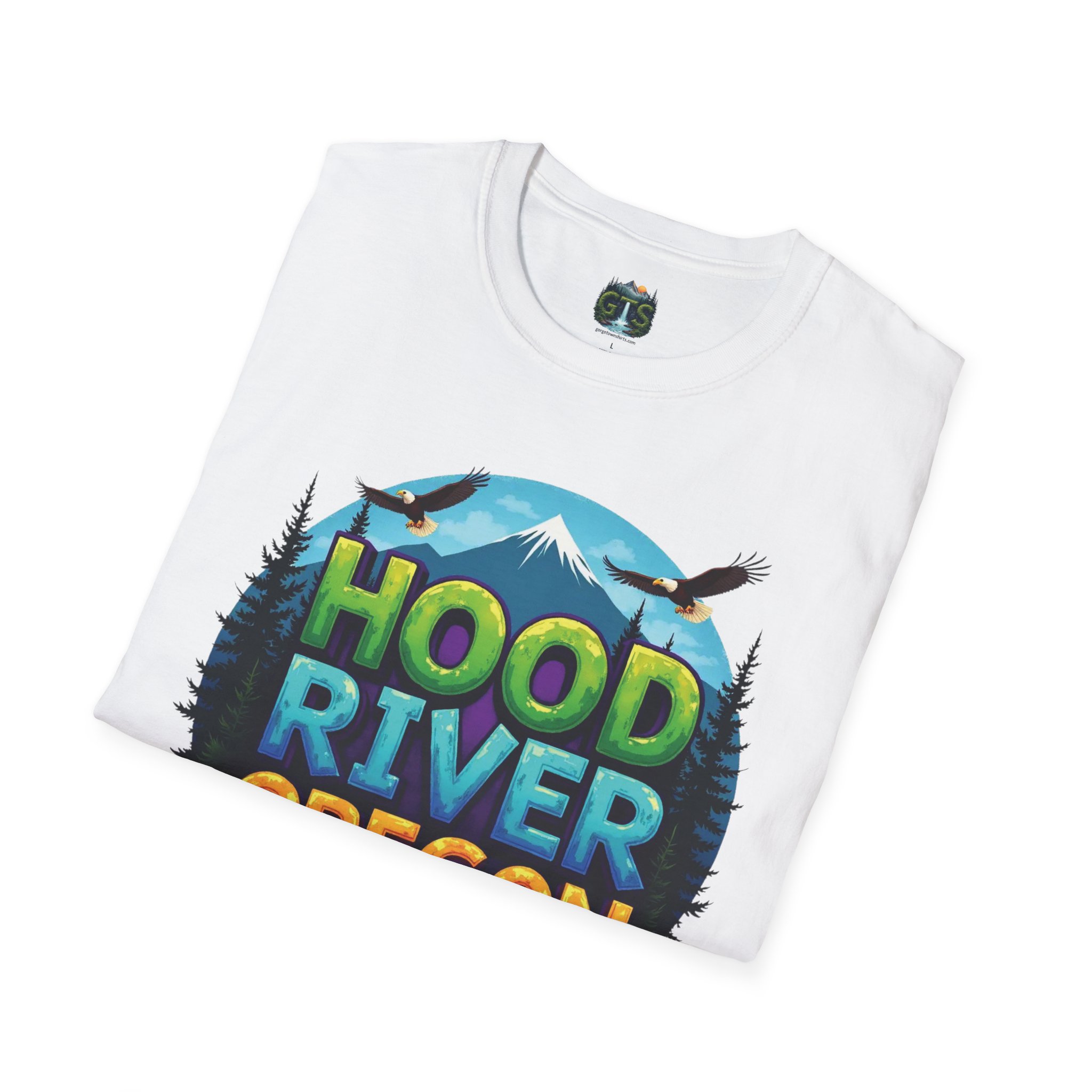 This lightweight cotton tee carries a bright, hand-illustrated tribute to Hood River, Oregon — towering evergreen silhouettes, a winding river, distant snow-capped peaks and eagles in flight surround bold, colorful lettering. It sits comfortably as an everyday layer for people who live for river runs, fruit orchards, mountain mornings and the small-town outdoors life. Wear it on park strolls, at the local brewpub after a day on the trails, or while packing for a weekend paddle; the soft ring-spun cotton keeps motion easy and the graphic holds its color with garment-safe printing. Subtle details like a tear-away label and stable shoulder tape keep the fit feeling broken-in but reliable after many wears.