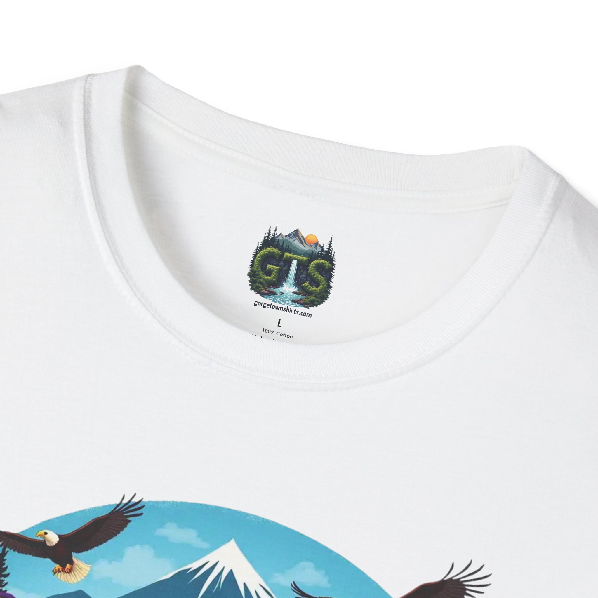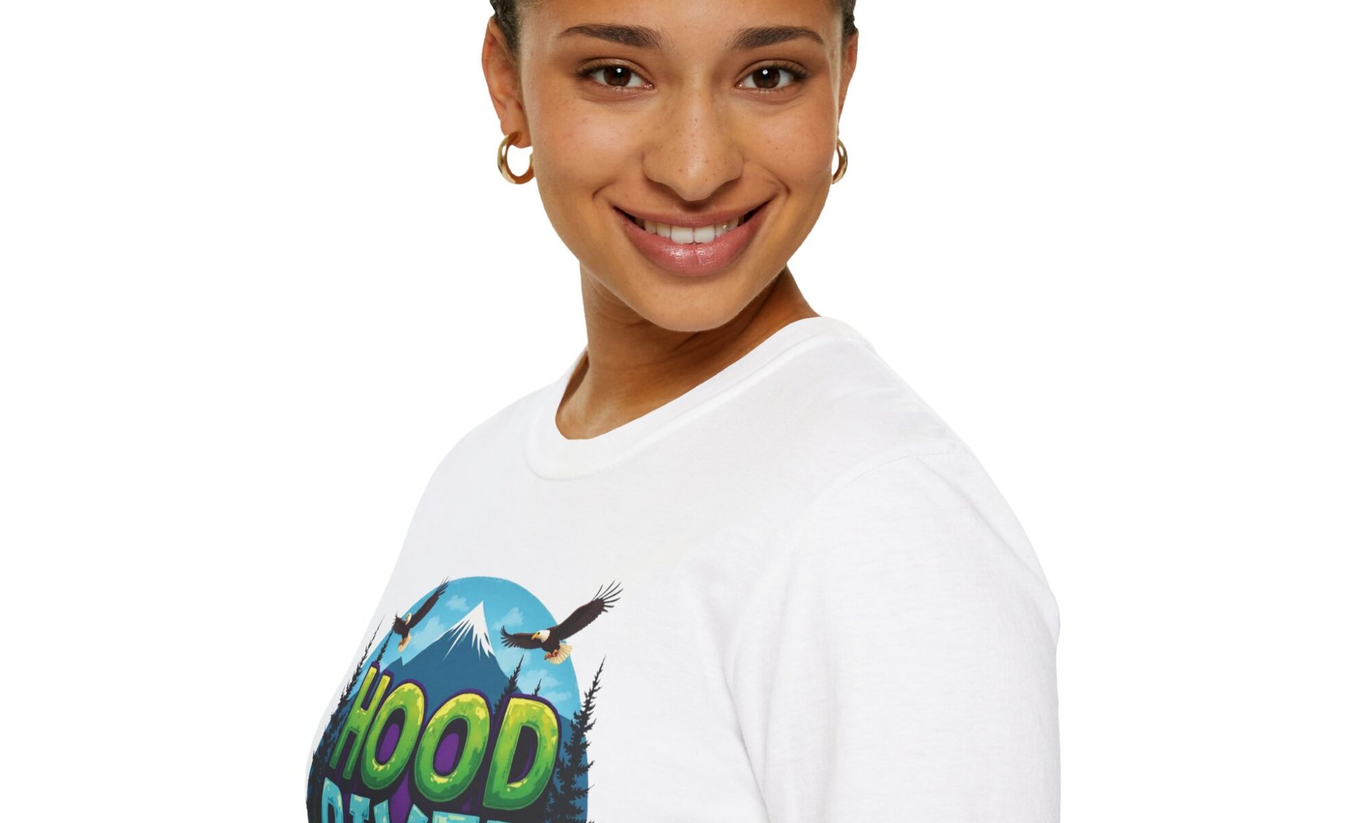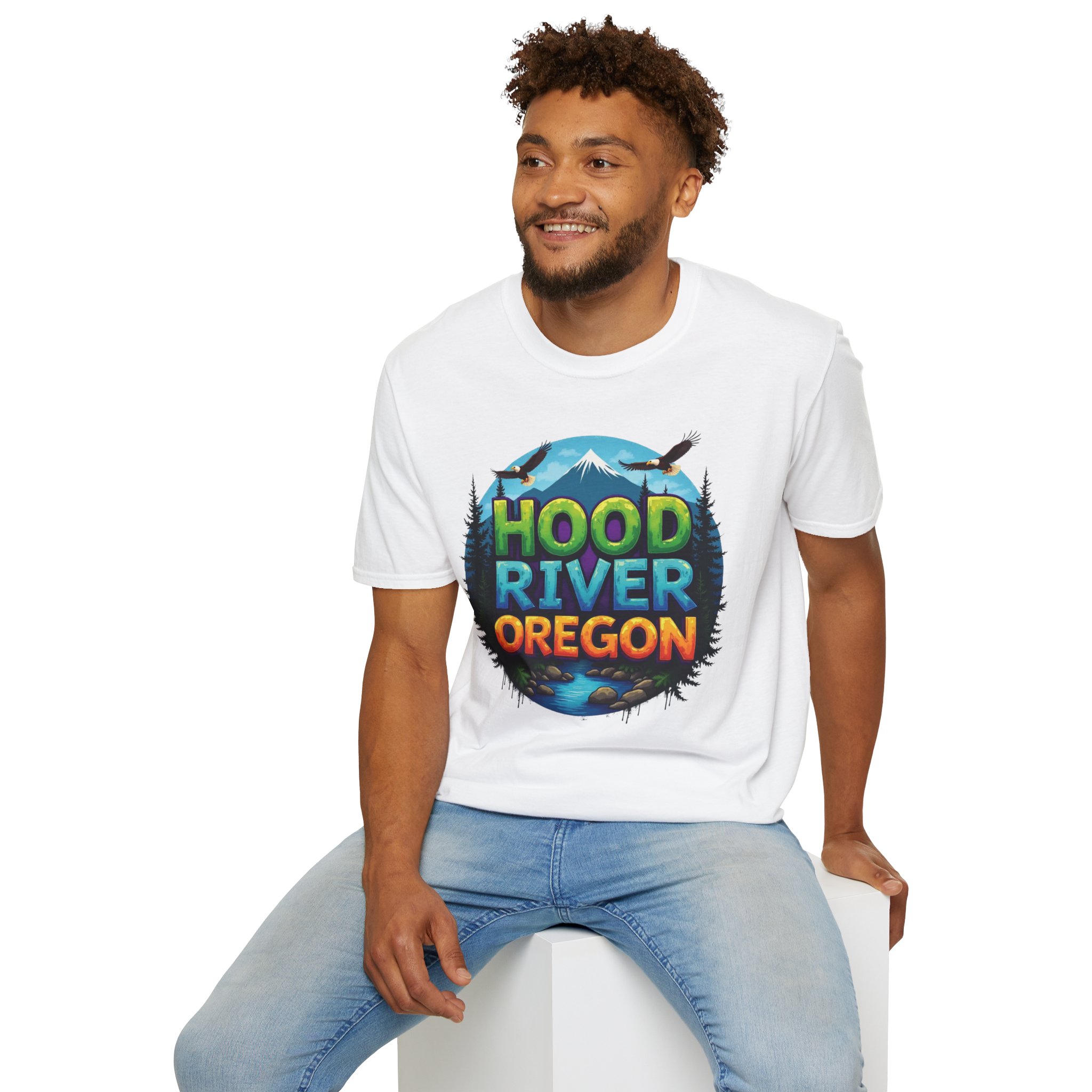 This lightweight cotton tee carries a bright, hand-illustrated tribute to Hood River, Oregon — towering evergreen silhouettes, a winding river, distant snow-capped peaks and eagles in flight surround bold, colorful lettering. It sits comfortably as an everyday layer for people who live for river runs, fruit orchards, mountain mornings and the small-town outdoors life. Wear it on park strolls, at the local brewpub after a day on the trails, or while packing for a weekend paddle; the soft ring-spun cotton keeps motion easy and the graphic holds its color with garment-safe printing. Subtle details like a tear-away label and stable shoulder tape keep the fit feeling broken-in but reliable after many wears.