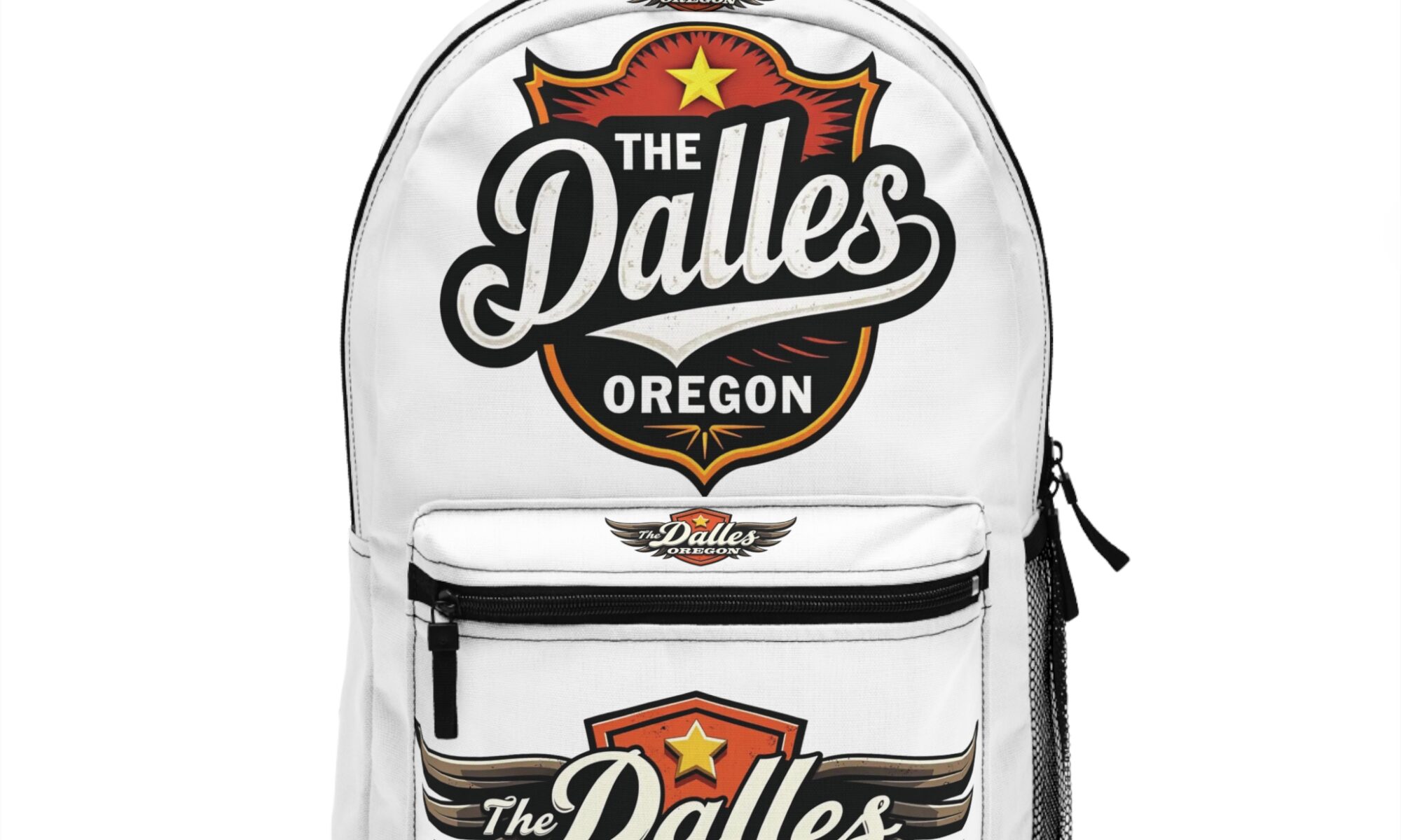 Carry a piece of The Dalles with you every day. This lightweight backpack blends bold, vintage-inspired emblem artwork with practical, travel-ready design. The shield-and-wing logo sits prominently on both the main body and front pocket, giving the bag a hometown pride look that works from campus to commuter rail. Cushioned mesh on the back and straps keeps long walks comfortable, while the organized pockets — plus a padded sleeve for a tablet or laptop — make it easy to move between work, errands, and weekend adventures. The clean white base keeps the crest-style colors striking, so the bag reads like a wearable poster for Oregon spirit.
